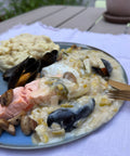 Ovenschoteltje met zalm, schelvishaasje, mosseltjes & scampi in een sausje op basis van huisbereide visfumet & smeuiige puree.