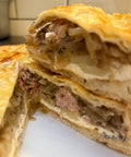Pizza-bladerdeegtaart, gevuld met mascarpone, Italiaanse worst, gefruite ajuin en aardappelschijfjes.