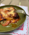 Afgewerkt met een romige tomatensaus en gegratineerd met Grana Padano.