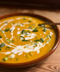 Spicy pompoen-wortelsoep met een oosters tintje door de kokosmelk en gember.
